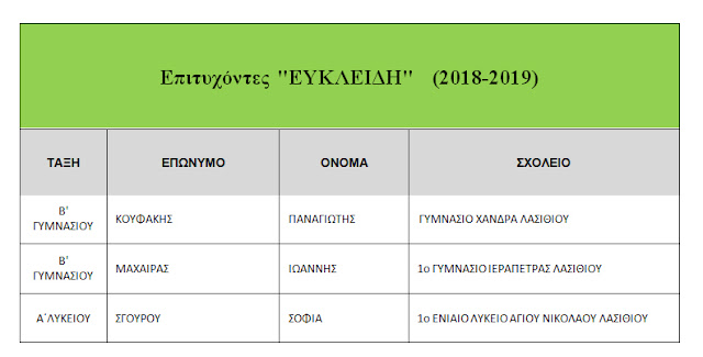 Το παράρτημα Λασιθίου της Ελληνικής Μαθηματικής Εταιρείας θα βραβεύσει σε ειδική τιμητική εκδήλωση πανηγυρικού χαρακτήρα, τους μαθητές του νομού που διακρίθηκαν με τις επιδόσεις τους στους πανελληνίους Μαθηματικούς διαγωνισμούς κατά το σχολικό έτος 2018-2019.