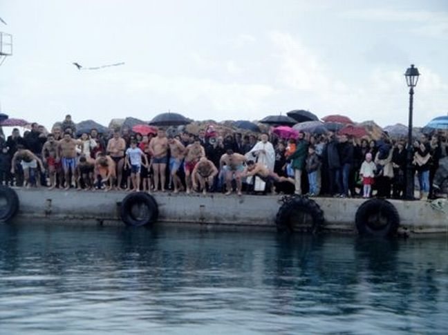 Πηδούν κάποιοι τολμηροί στα παγωμένα νερά και συναγωνίζονται ποιος θα τον πρωτοπιάσει. Αυτός που θα τον ανεβάσει στην επιφάνεια θεωρείται ότι θα έχει καλή τύχη κι υγεία για όλο το χρόνο.